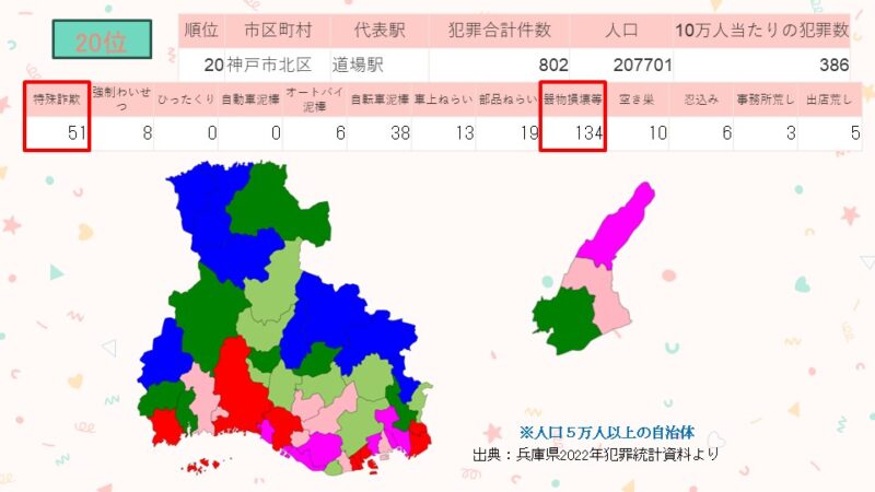 神戸市兵庫区は10万人当たりの犯罪数が1421件で兵庫県内で2番治安が悪い街になりました。