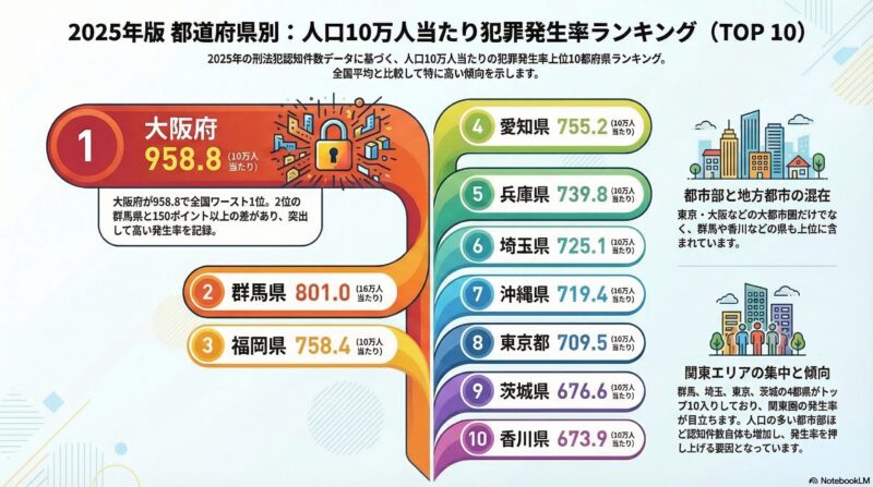 本分析では、正確な「人口10万人当たりの犯罪発生率」を導き出し、各都道府県の犯罪傾向から読み取れる「なぜその順位なのか」という理由解説します。